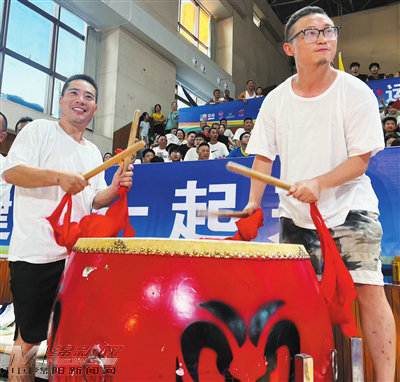 比賽開始后,伴隨鏗鏘有力的音樂旋律,兩隊球員縱橫馳騁、你追我趕,比分交替上升。每一次精彩的攻防轉(zhuǎn)換都激發(fā)歡樂的高潮:加油的戰(zhàn)鼓聲震耳發(fā)聵,“魔丸必勝!”“安州雄起!”的聲聲吶喊在球館里回蕩。第二節(jié)賽時結(jié)束,“魔丸隊”與“安der逸”比分為34∶25。