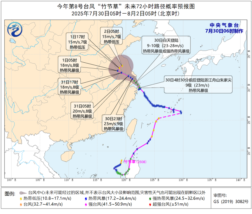 預(yù)計(jì),“竹節(jié)草”將以每小時(shí)10-15公里的速度向北偏西方向移動(dòng),強(qiáng)度將有所增強(qiáng),將于30日白天在浙江寧波到江蘇啟東一帶沿海再次登陸(23-28米/秒,9-10級(jí),熱帶風(fēng)暴級(jí)或強(qiáng)熱帶風(fēng)暴級(jí)),登陸后強(qiáng)度緩慢減弱。