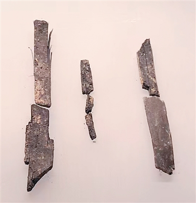 展柜里的碳化竹片出土于寶墩古城一處紅燒土基址中,是竹骨泥墻式居住建筑的構(gòu)件。圖文展板和視頻展示了此類建筑的修筑過程:先在平地挖基槽,然后在基槽內(nèi)插入竹子,再將泥土與木屑混合攪拌,均勻涂抹在竹子表面,最后在墻體周圍堆放薪材,點(diǎn)火烘烤,加固墻體。