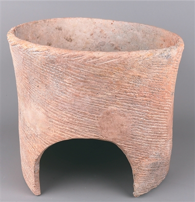一尊設(shè)計精巧的陶灶吸引了觀眾的目光。陶灶呈鼓形,一側(cè)有近半圓形的灶門,外壁飾粗繩紋,內(nèi)部等距分布有7個長約7厘米的支丁,用于支撐炊具。4000多年前的寶墩先民就是用這樣的陶灶來烹煮食物,有人稱其為“成都平原第一灶”。