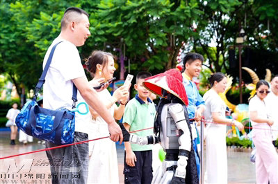游客在綿陽方特東方神畫與“機械俠客”互動