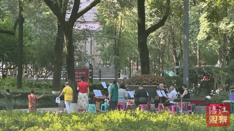 陳婆婆家住花園片區(qū),每天早上7點(diǎn)多就來到人民公園昭烈讀書樓外,這里匯聚了許多像她一樣早起的伙伴。他們跟隨音樂和樂器跳舞鍛煉,累了休息片刻再繼續(xù),直至10點(diǎn)左右結(jié)束。