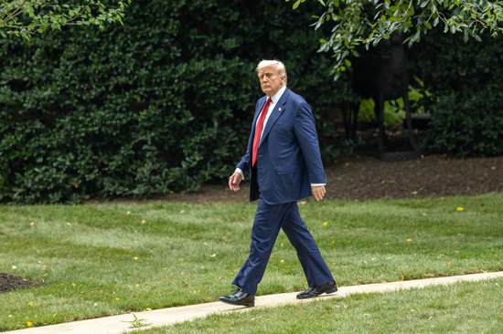8月1日,在美國首都華盛頓白宮,美國總統(tǒng)特朗普走向南草坪。新華社記者胡友松攝