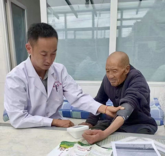 2025年6月,趙成春入戶隨訪時給村民測血壓。(受訪者供圖)
