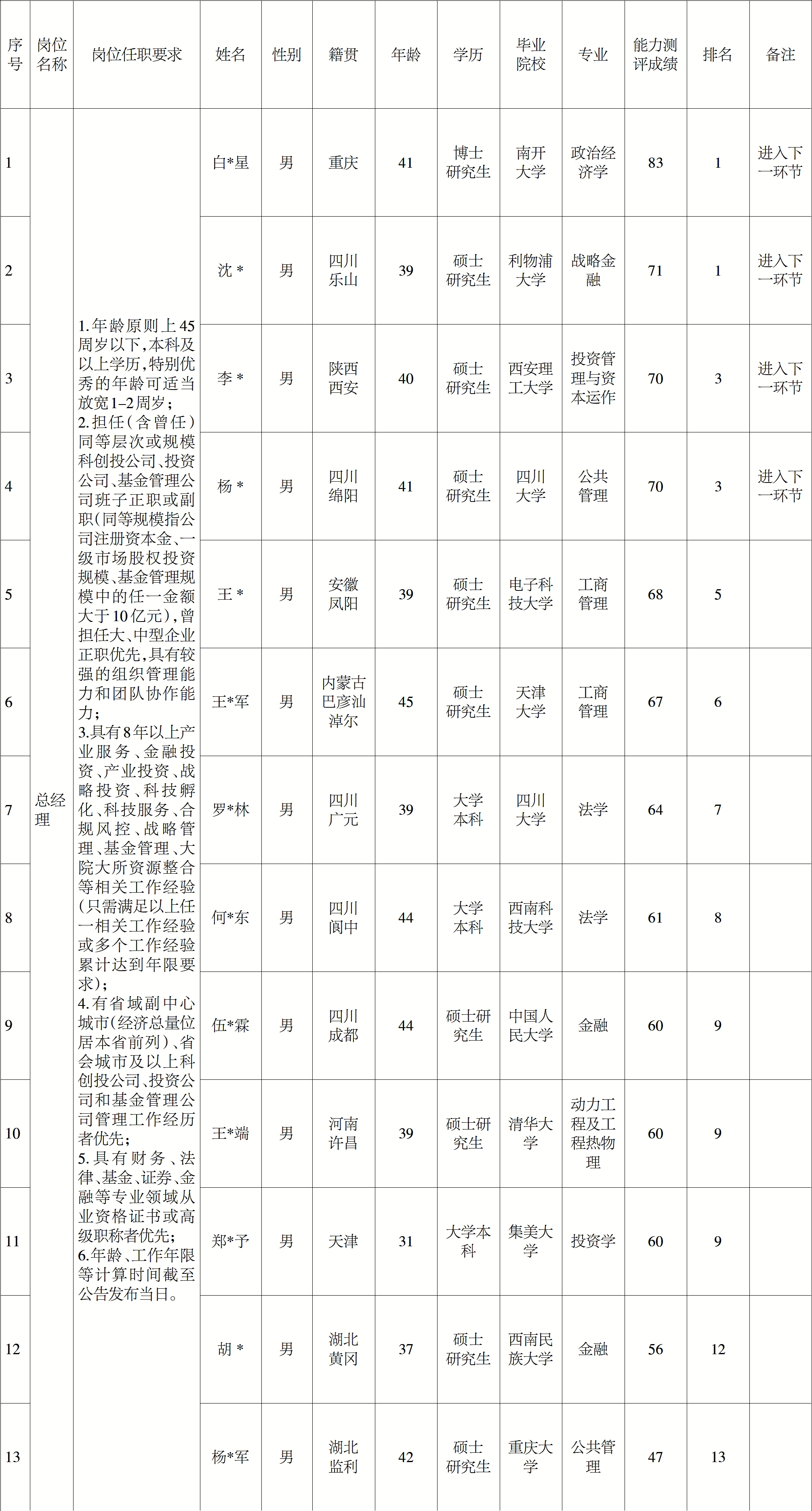 根據(jù)綿陽科技城科技創(chuàng)新投資有限公司發(fā)布的總經(jīng)理選聘公告及選聘相關(guān)規(guī)定,現(xiàn)將能力測評成績予以公示。