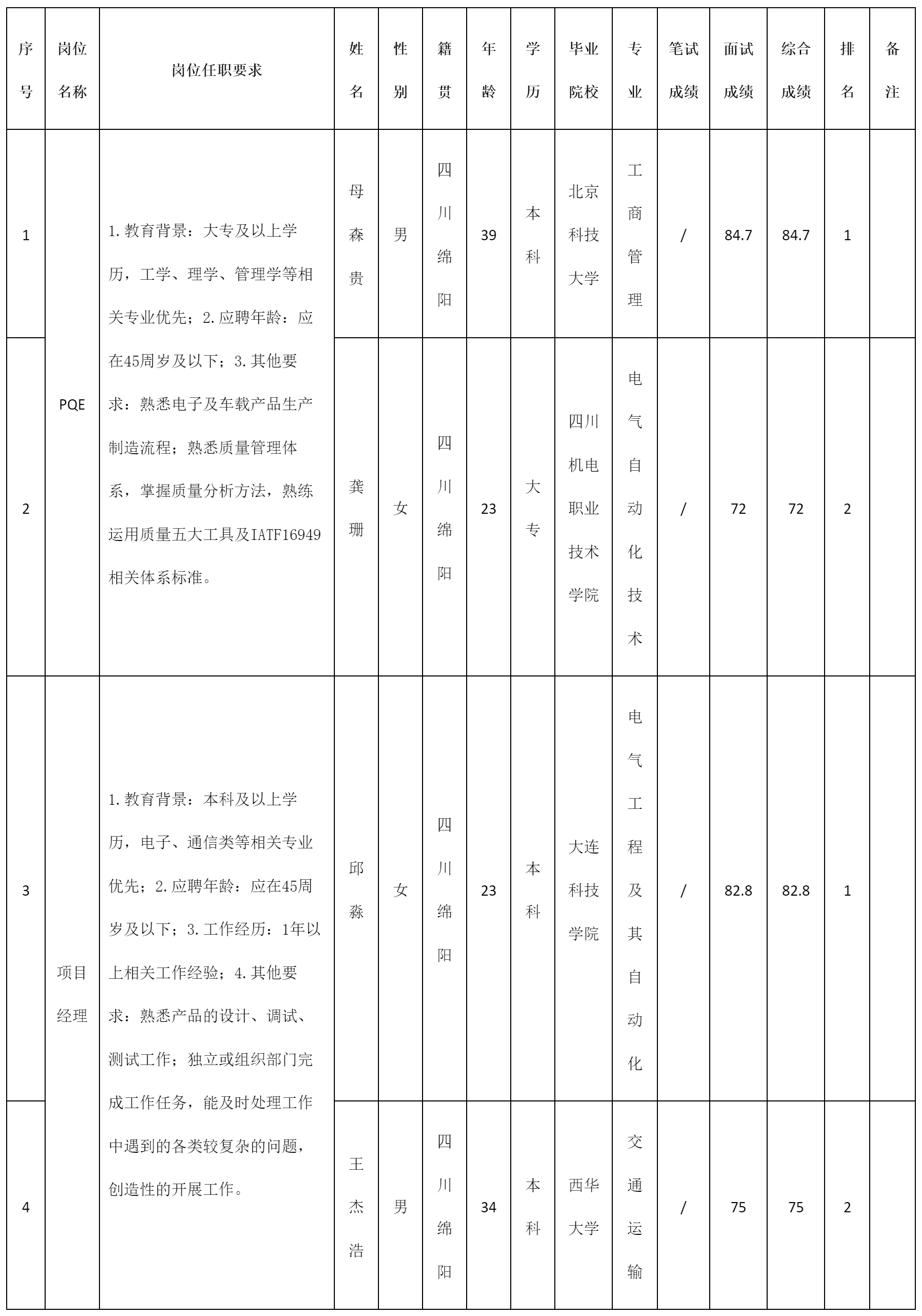 根據(jù)四川九州電子科技股份有限公司發(fā)布的招聘公告及招聘相關(guān)規(guī)定,經(jīng)筆試、面試等程序,現(xiàn)將筆試(面試)成績予以公示。