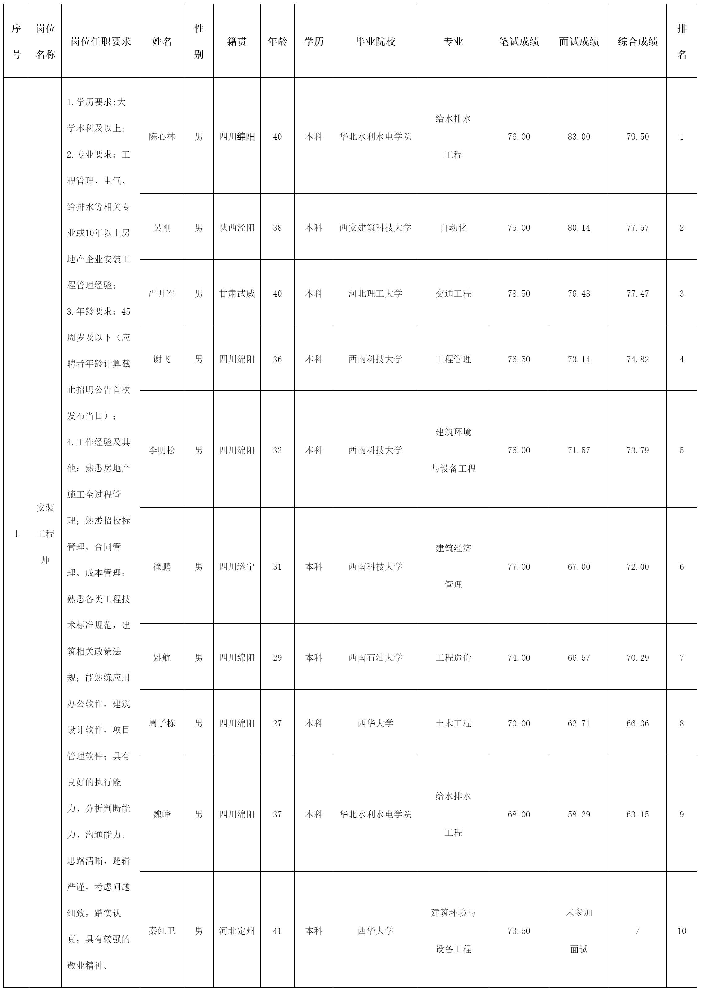 根據(jù)綿陽市綿投置地有限公司發(fā)布的招聘公告及招聘相關(guān)規(guī)定,經(jīng)筆試、面試等程序,現(xiàn)將筆試、面試成績予以公示。