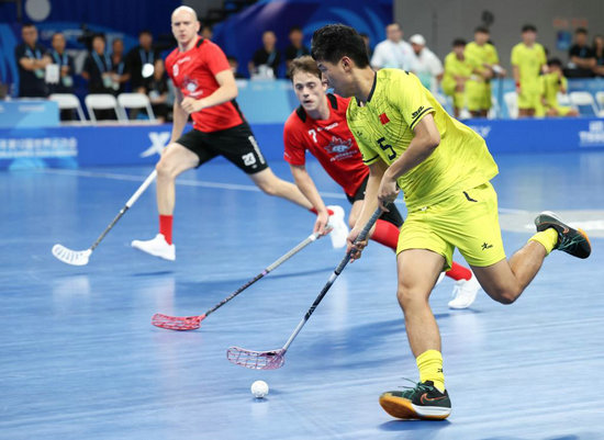 8月10日,中國隊球員張志恒(前)在比賽中帶球進(jìn)攻。當(dāng)日,在2025年成都世運會軟式曲棍球男子B組預(yù)賽中,中國隊不敵加拿大隊。新華社記者 梁旭 攝