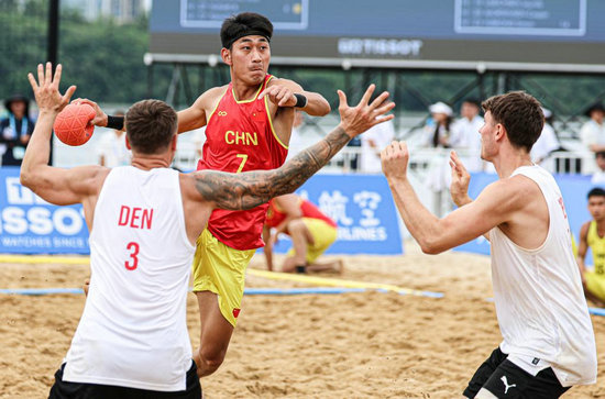8月11日,中國隊球員任健豪(上)在比賽中進(jìn)攻。當(dāng)日,在2025年成都世運會沙灘手球男子第5-8名安慰賽半決賽中,中國隊0比2不敵丹麥隊。新華社記者 劉坤 攝