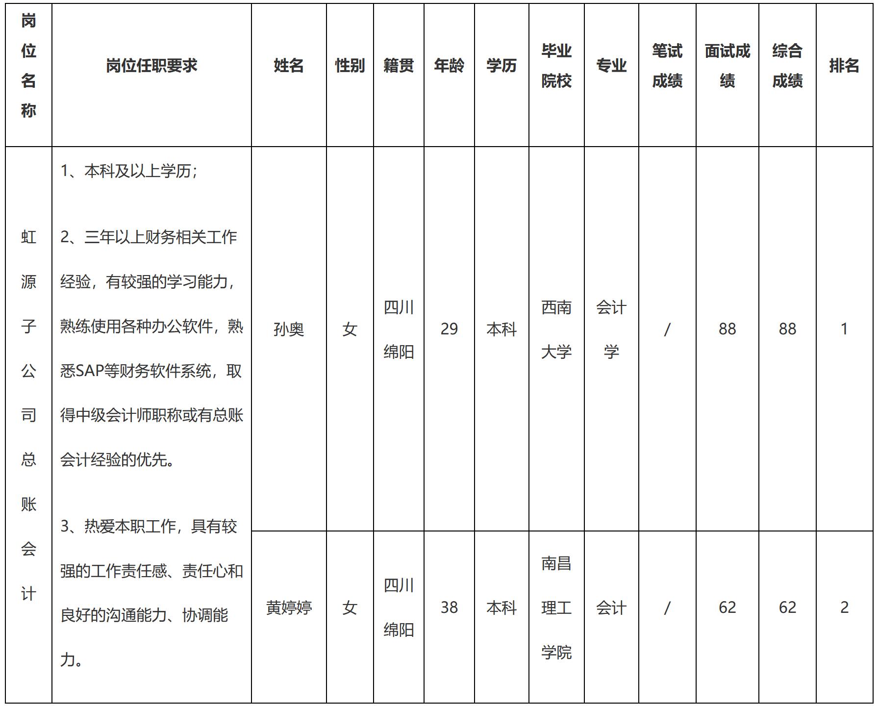 根據(jù)長(zhǎng)虹電源公司發(fā)布的招聘公告及招聘相關(guān)規(guī)定,經(jīng)面試等程序,現(xiàn)將面試成績(jī)予以公示。