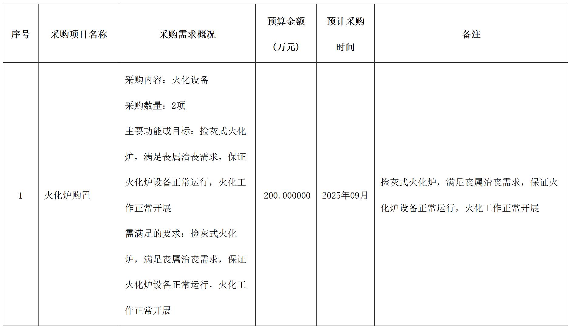 為便于供應商及時了解政府采購信息,根據(jù)《財政部關于開展政府采購意向公開工作的通知》(財庫〔2020〕10號)等有關規(guī)定,現(xiàn)將綿陽市殯儀館2025年度(第批)采購意向公開如下: