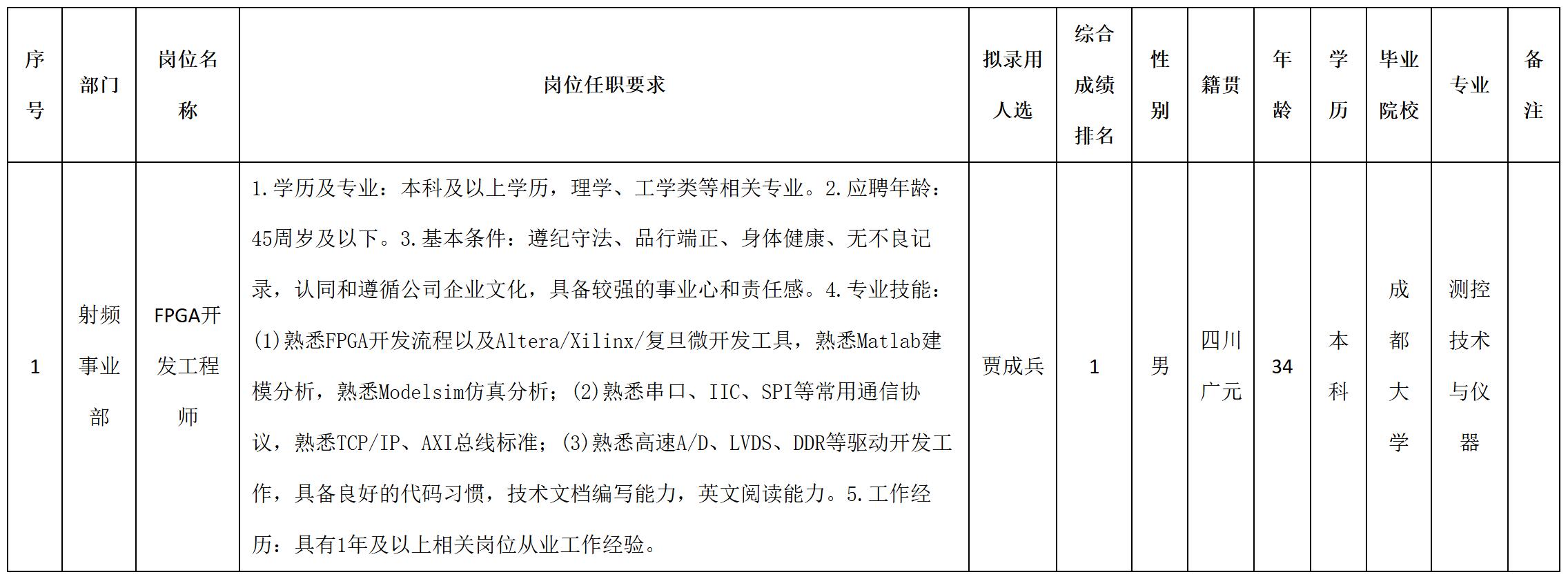 根據(jù)四川九強通信科技有限公司發(fā)布的招聘公告及招聘相關(guān)規(guī)定,經(jīng)筆試、面試、考察、體檢等程序,擬錄用賈成兵同志到四川九強通信科技有限公司工作,現(xiàn)予以公示,具體情況如下: