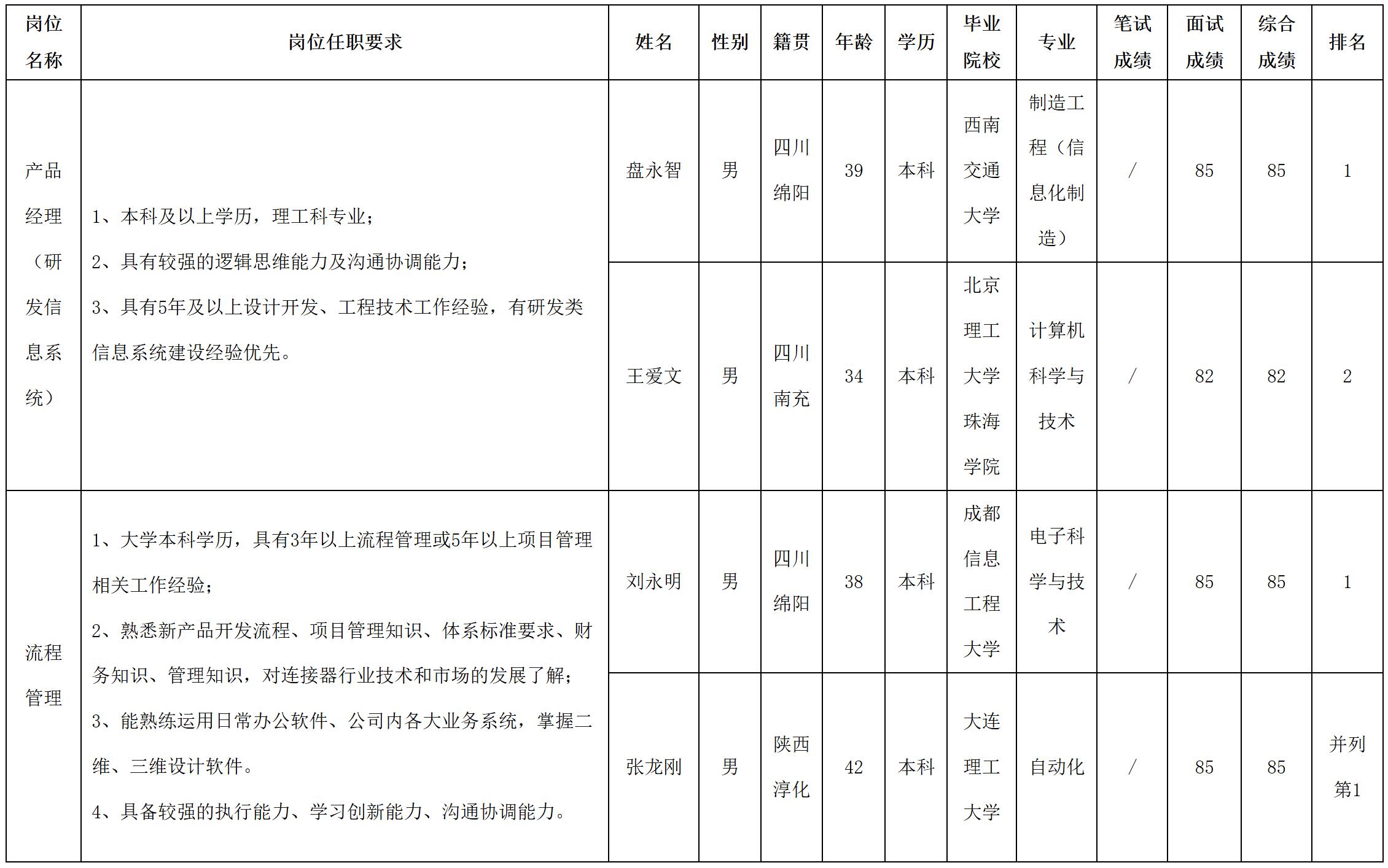 根據(jù)四川華豐科技股份有限公司發(fā)布的招聘公告及招聘相關(guān)規(guī)定,經(jīng)筆試、面試等程序,現(xiàn)將筆試(面試)成績(jī)予以公示。
