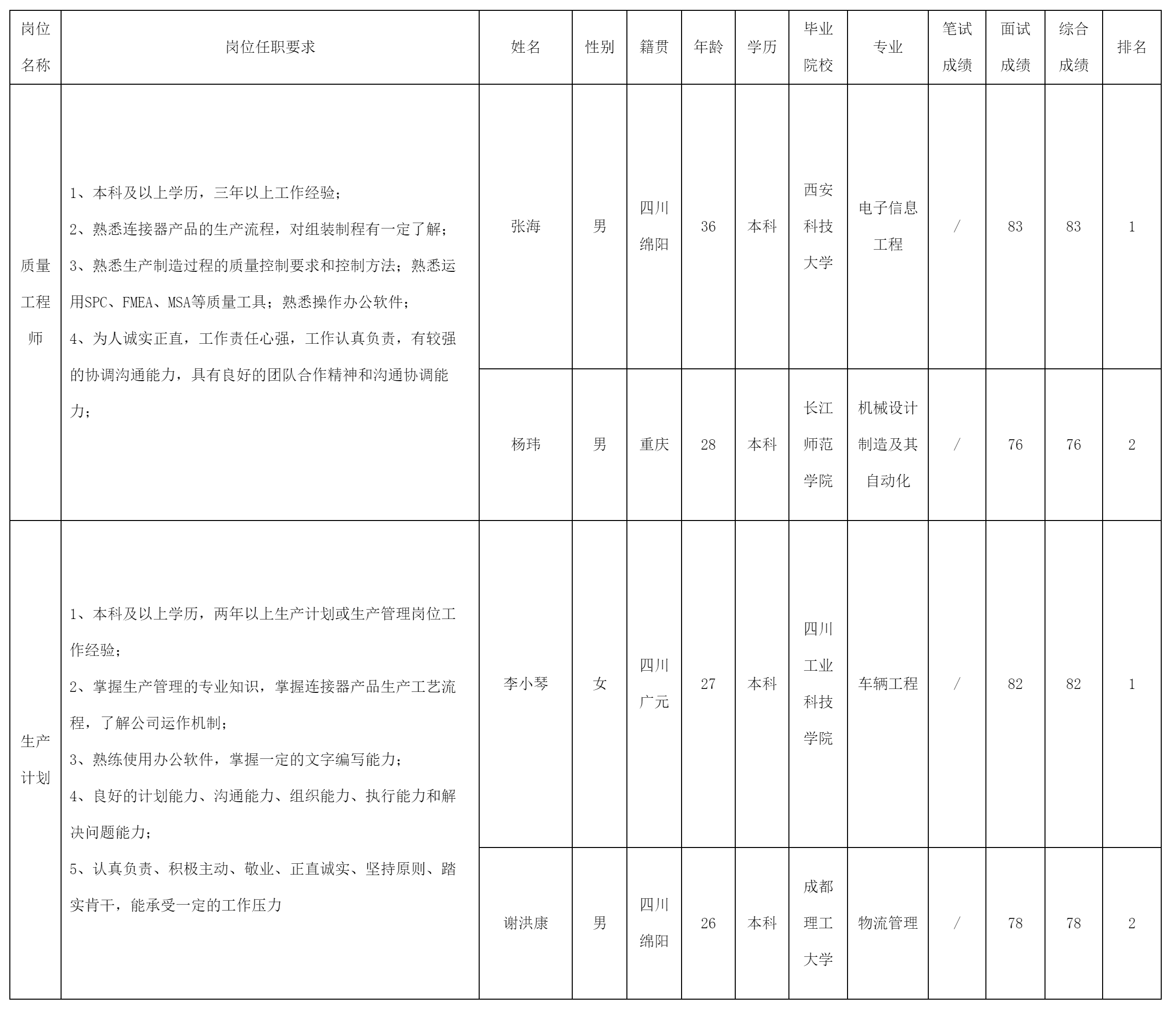 根據(jù)四川華豐科技股份有限公司發(fā)布的招聘公告及招聘相關規(guī)定,經(jīng)筆試、面試等程序,現(xiàn)將筆試(面試)成績予以公示。