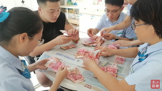 工作人員嚴格按照規(guī)定專業(yè)耐心地進行剝離、清理、核對,避免造成二次損毀并確保每張紙幣的防偽特征與殘損程度鑒定精準。經過近2小時清點,成功為客戶兌換1.8萬元,挽回了近90%的損失。
