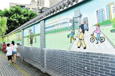 鄰里互助、光盤(pán)行動(dòng)、文明遛犬、節(jié)約水電、移風(fēng)易俗、消防安全、文明旅游、垃圾分類(lèi)……近日,記者在涪城區(qū)宇虹北街西二巷平政河畔看到,河岸一側(cè)長(zhǎng)約400米的圍墻上,描繪著數(shù)十幅色彩亮麗的主題彩繪組成的“文明號(hào)高速動(dòng)車(chē)”。每段墻繪即是一堂文明課,內(nèi)容豐富,生動(dòng)有趣,兼具藝術(shù)美感,與古樸青灰色調(diào)的滴水瓦、墻體相映成景,成為居民身邊一道靚麗的文明風(fēng)景線。 (記者 王勇 攝影報(bào)道)