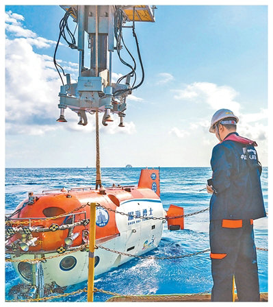 “深海勇士”號載人深潛器布放(資料照片)。國家文物局供圖(新華社發(fā))