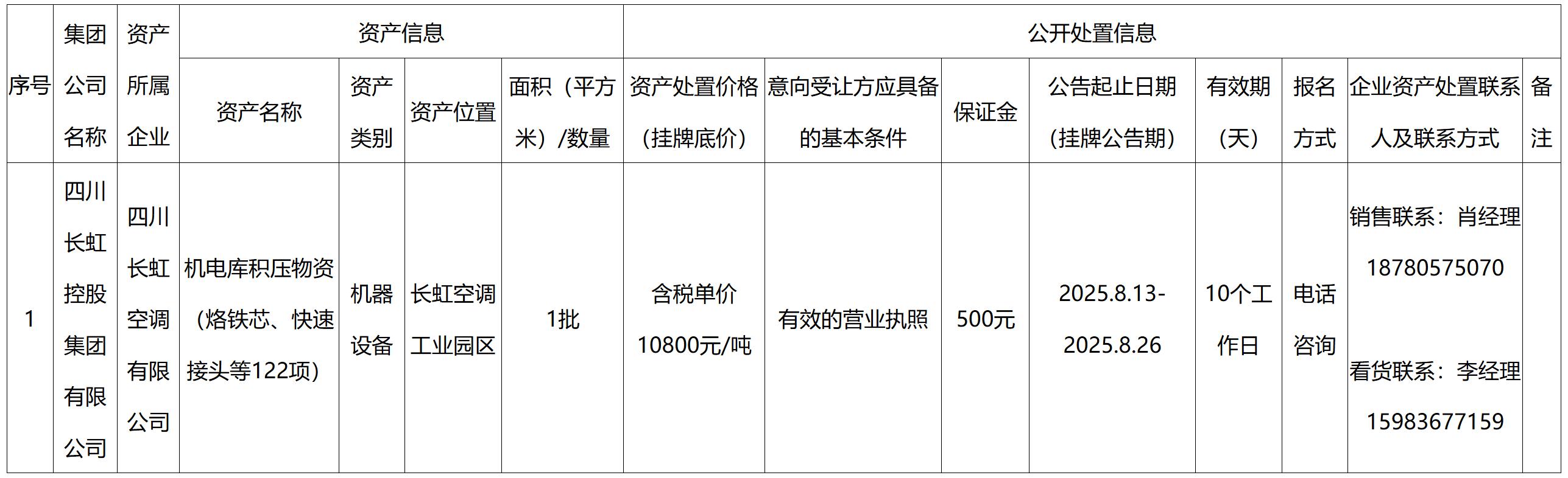 四川長虹空調(diào)有限公司企業(yè)資產(chǎn)處置公告