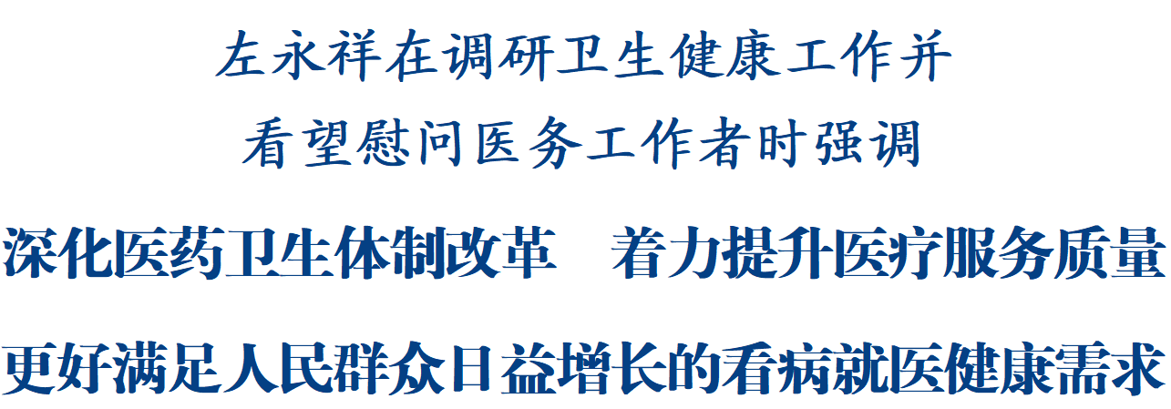 在第八個中國醫(yī)師節(jié)即將到來之際,8月18日,省委常委、市委書記左永祥前往市緊急救援指揮中心、市屬醫(yī)院、基層衛(wèi)生院調研衛(wèi)生健康工作,并看望慰問醫(yī)務工作者,代表市委、市政府向全市廣大醫(yī)務工作者致以節(jié)日問候和崇高敬意。他強調,要深入學習貫徹習近平總書記關于健康中國建設的重要論述和對四川工作系列重要指示精神,全面落實黨中央和省委部署要求,以實施健康優(yōu)先發(fā)展戰(zhàn)略、健康中國戰(zhàn)略、人口發(fā)展戰(zhàn)略為引領,深化醫(yī)藥衛(wèi)生體制改革,著力提升醫(yī)療服務質量,更好滿足人民群眾日益增長的看病就醫(yī)健康需求。