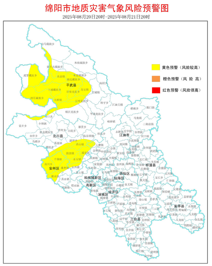 8月20日20時(shí)-8月21日20時(shí),綿陽(yáng)以下地區(qū)發(fā)生地質(zhì)災(zāi)害的風(fēng)險(xiǎn)較高(黃色預(yù)警),請(qǐng)重點(diǎn)防范: