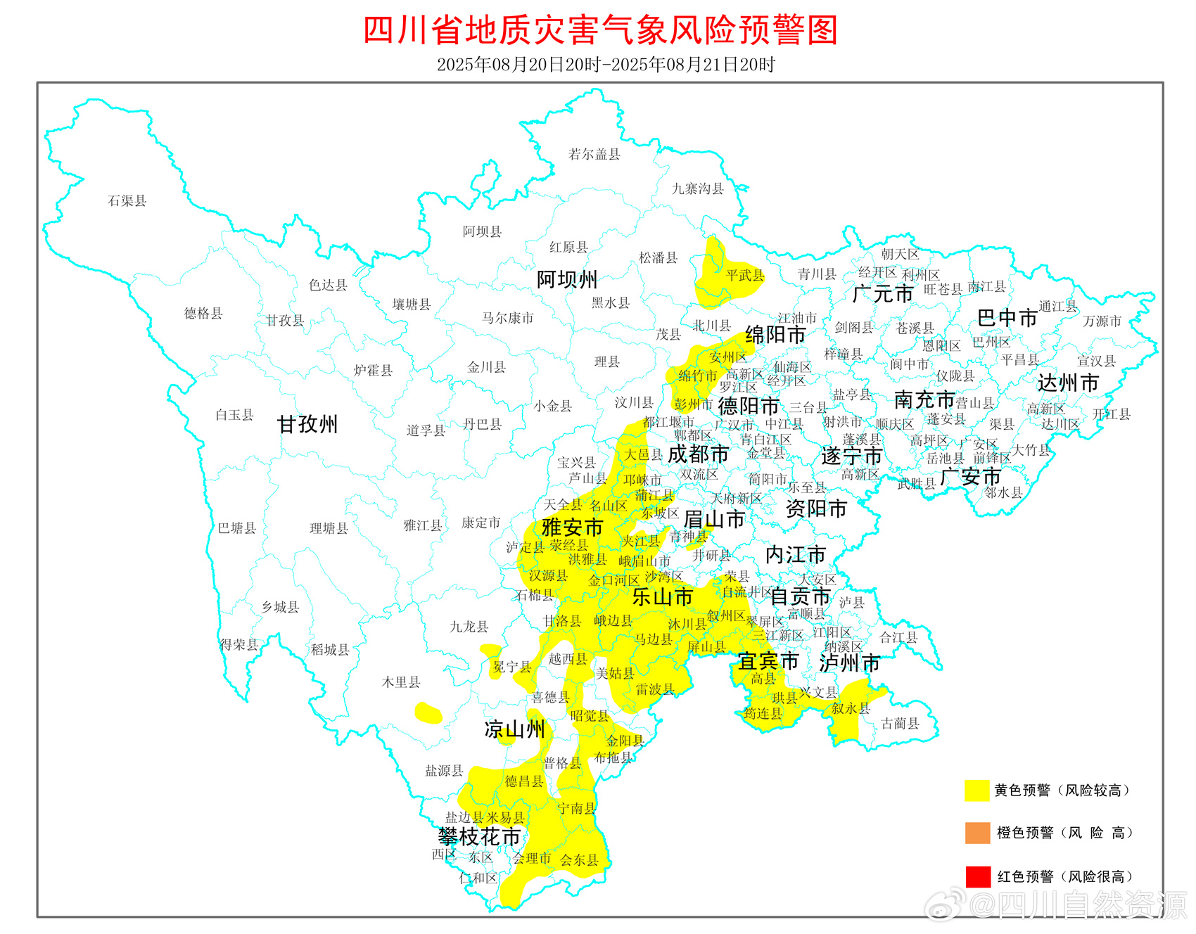 根據(jù)四川省氣象臺天氣預(yù)報情況,結(jié)合四川省地質(zhì)環(huán)境條件,8月20日20時至8月21日20時,全省地質(zhì)災(zāi)害氣象風(fēng)險預(yù)警結(jié)果如下: