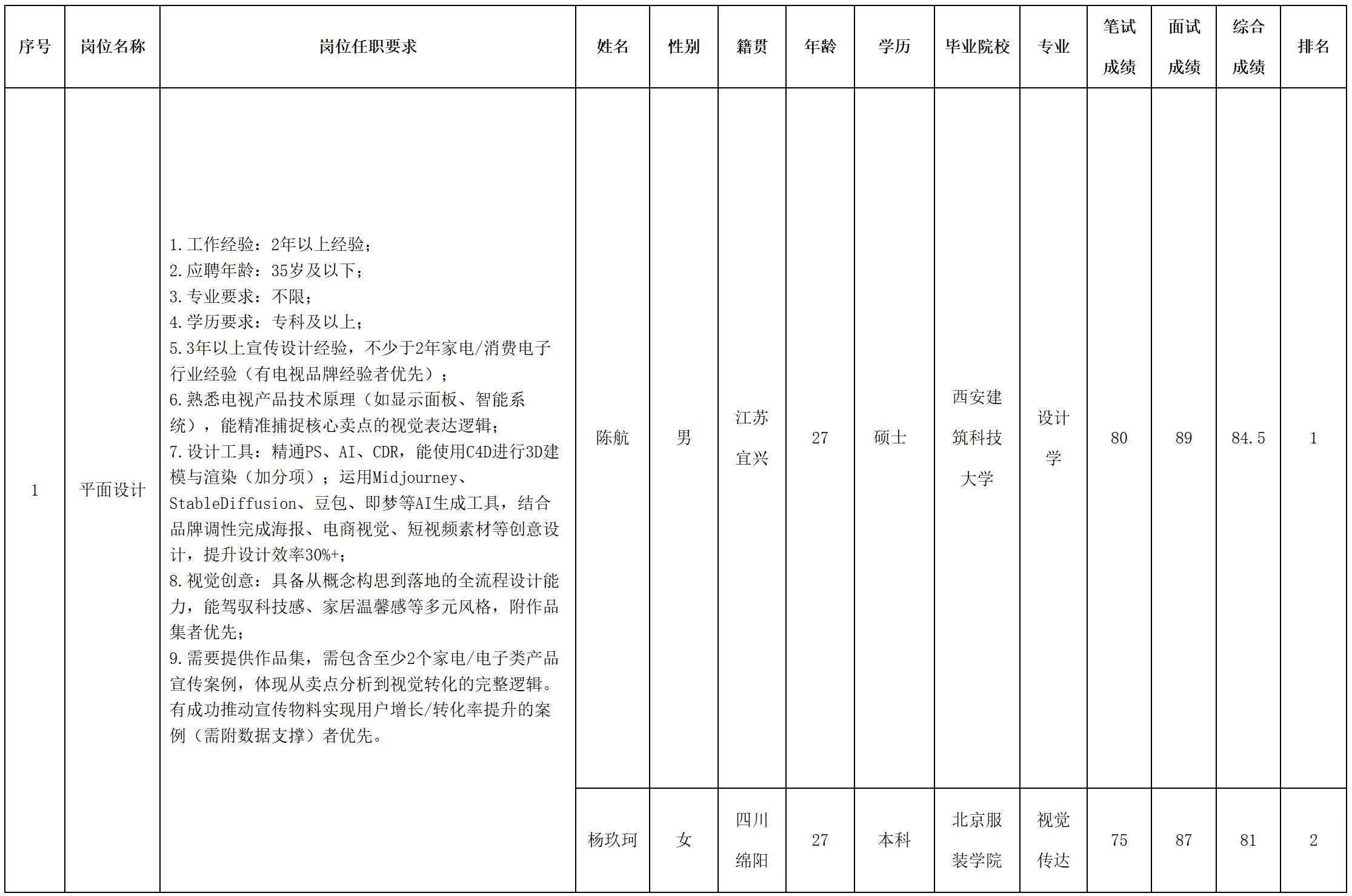 根據(jù)長(zhǎng)虹·美菱中國(guó)區(qū)營(yíng)銷總部發(fā)布的招聘公告及招聘相關(guān)規(guī)定,經(jīng)面試程序,現(xiàn)將面試成績(jī)予以公示。