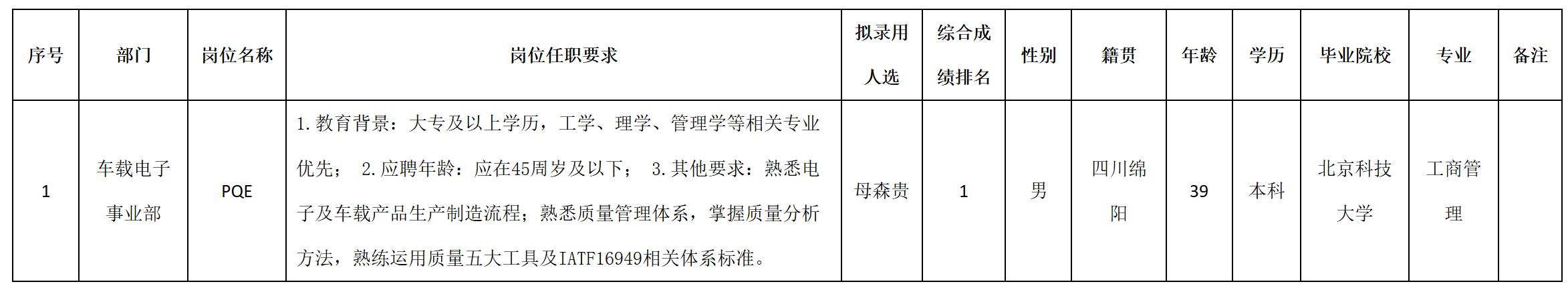 根據(jù)四川九州電子科技股份有限公司發(fā)布的招聘公告及招聘相關(guān)規(guī)定,經(jīng)筆試、面試、考察、體檢等程序,擬錄用母森貴同志到四川九州電子科技股份有限公司工作,現(xiàn)予以公示,具體情況如下: