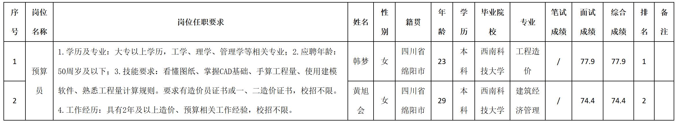 根據(jù)四川九洲建筑工程有限責任公司發(fā)布的招聘公告及招聘相關(guān)規(guī)定,經(jīng)筆試、面試等程序,現(xiàn)將筆試(面試)成績予以公示。