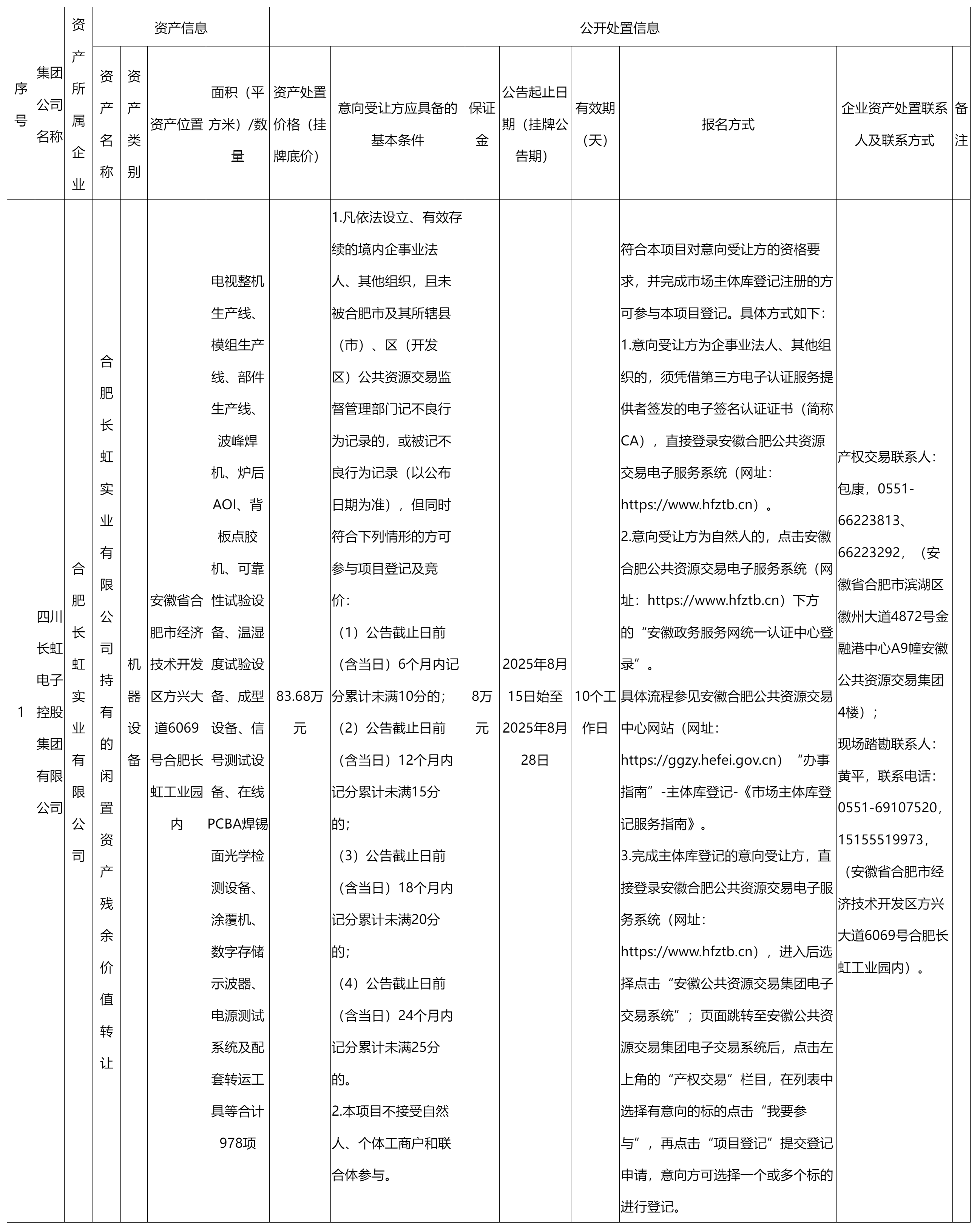 合肥長虹實(shí)業(yè)有限公司閑置資產(chǎn)處置公告