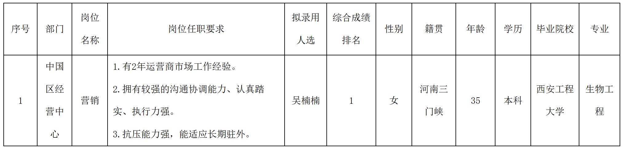 根據(jù)四川長虹新網(wǎng)科技有限責(zé)任公司發(fā)布的招聘公告及招聘相關(guān)規(guī)定,經(jīng)筆試、面試、考察、體檢等程序,擬錄用吳楠楠同志到公司工作,現(xiàn)予以公示,具體情況如下: