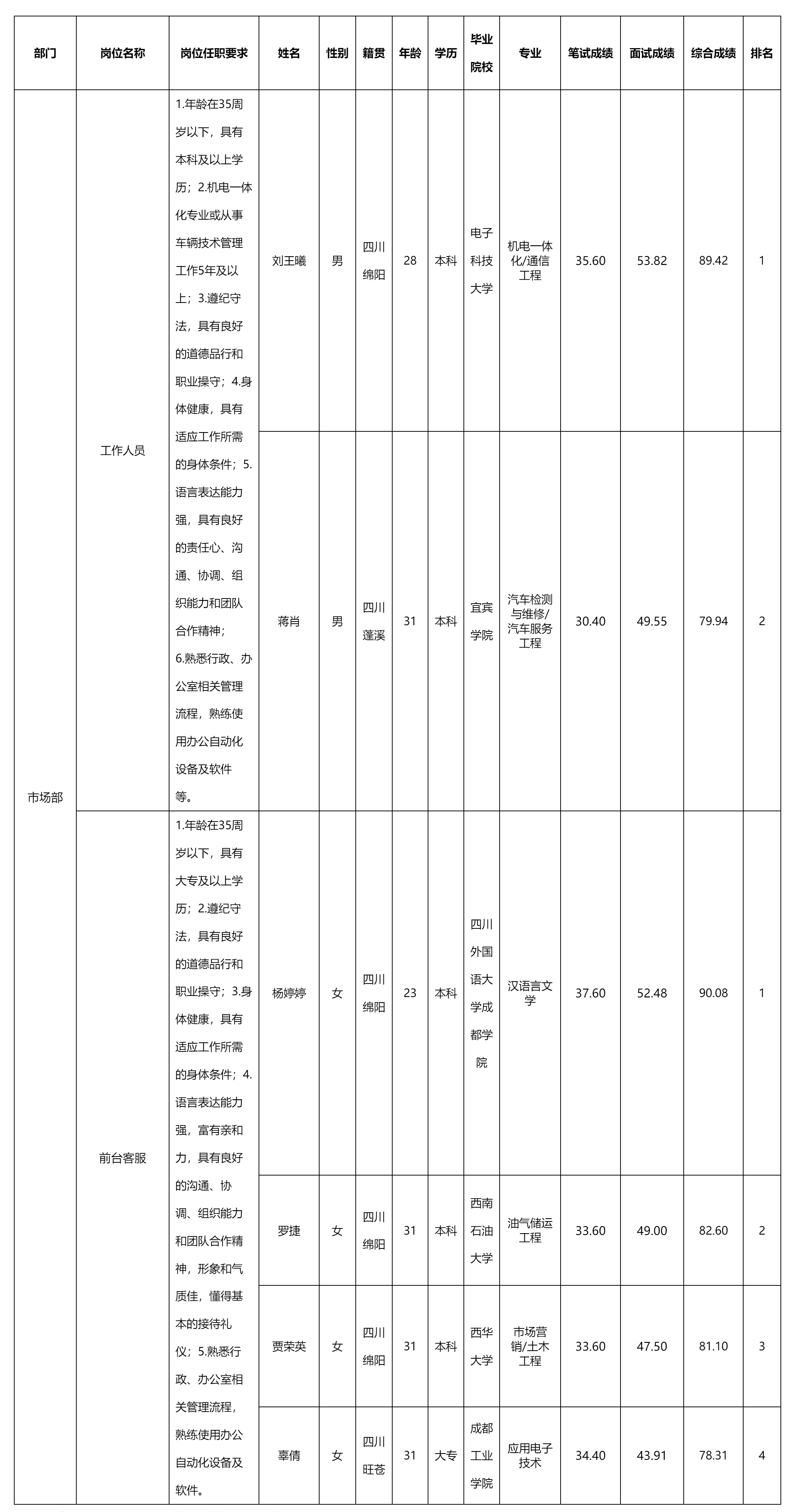 根據(jù)綿陽市公交遠航汽車服務(wù)有限責(zé)任公司發(fā)布的招聘公告及招聘相關(guān)規(guī)定,經(jīng)筆試、面試等程序,現(xiàn)將綜合成績予以公示。