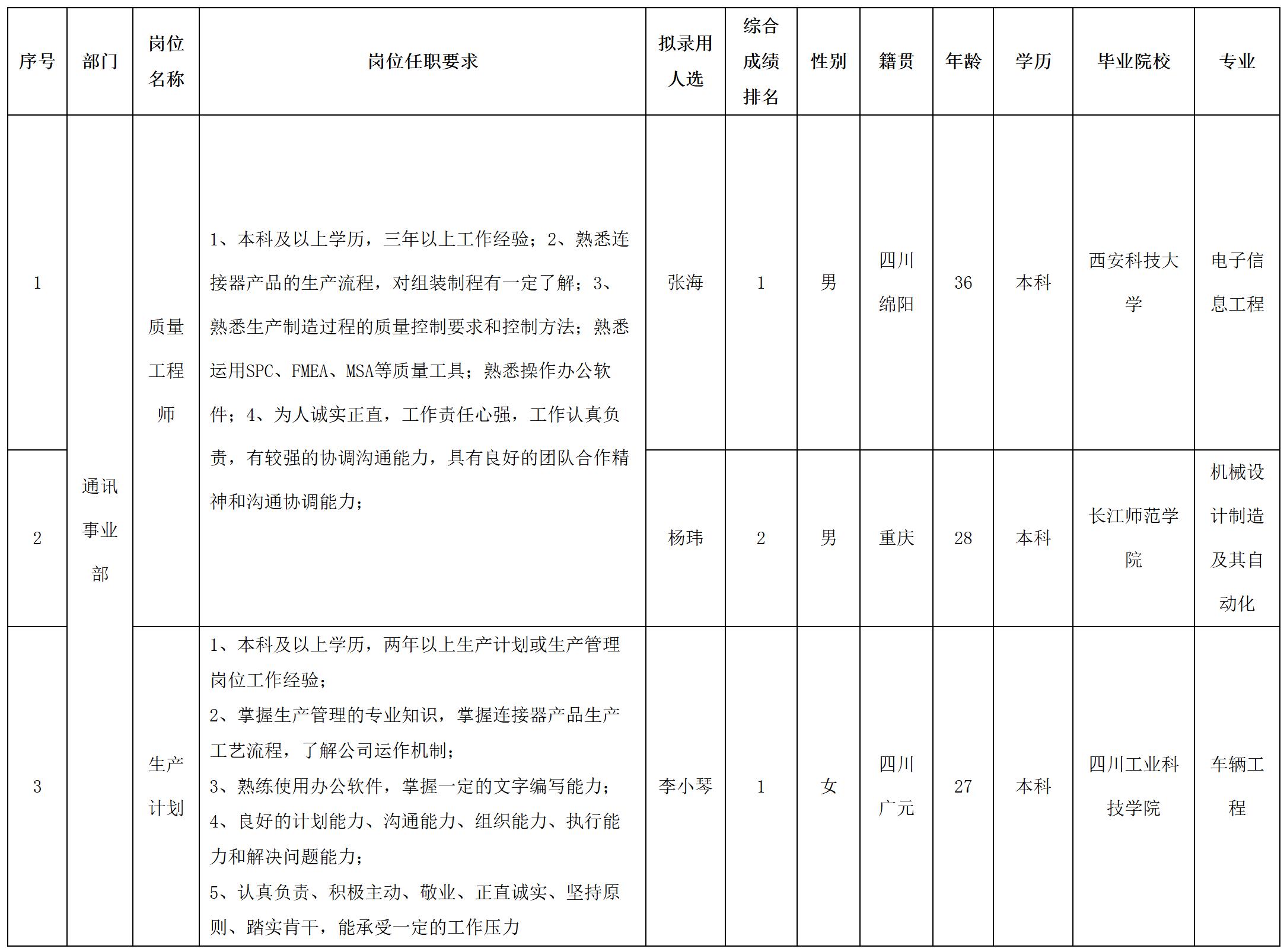 根據(jù)四川華豐科技股份有限公司發(fā)布的招聘公告及招聘相關(guān)規(guī)定,經(jīng)面試等程序,擬錄用張海等同志到四川華豐科技股份有限公司工作,現(xiàn)予以公示,具體情況如下: