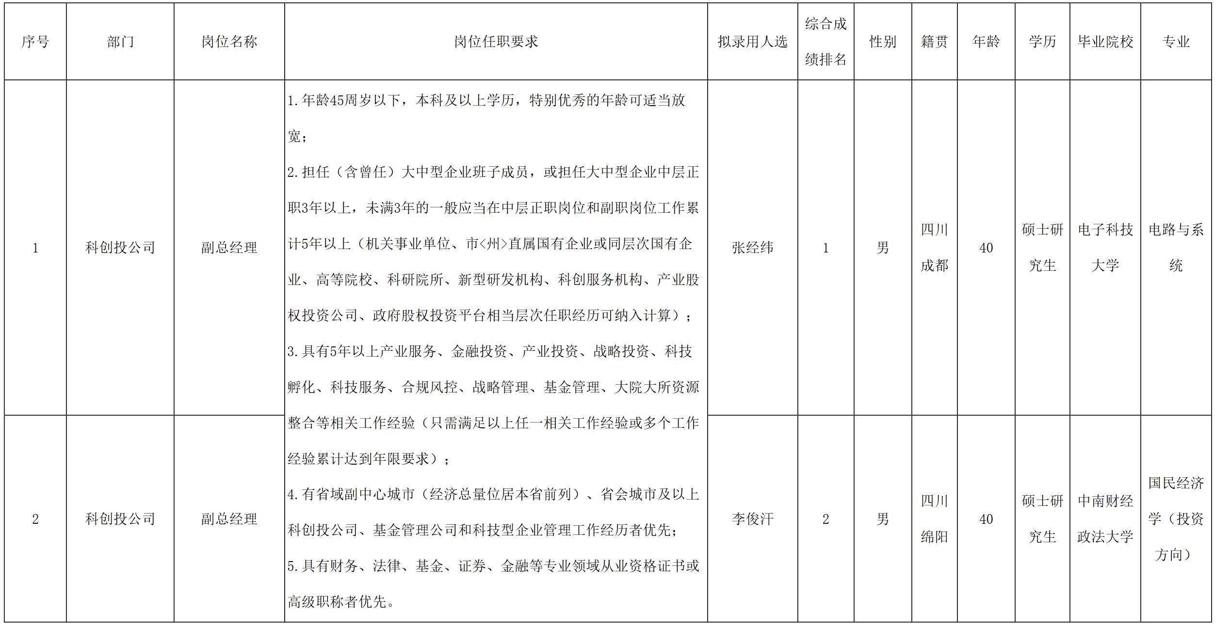 根據綿陽科技城科技創(chuàng)新投資有限公司發(fā)布的選聘公告及選聘相關規(guī)定,經能力測評、面試、考察、體檢等程序,擬錄用張經緯、李俊汗同志到綿陽科技城科技創(chuàng)新投資有限公司工作,現予以公示,具體情況如下: