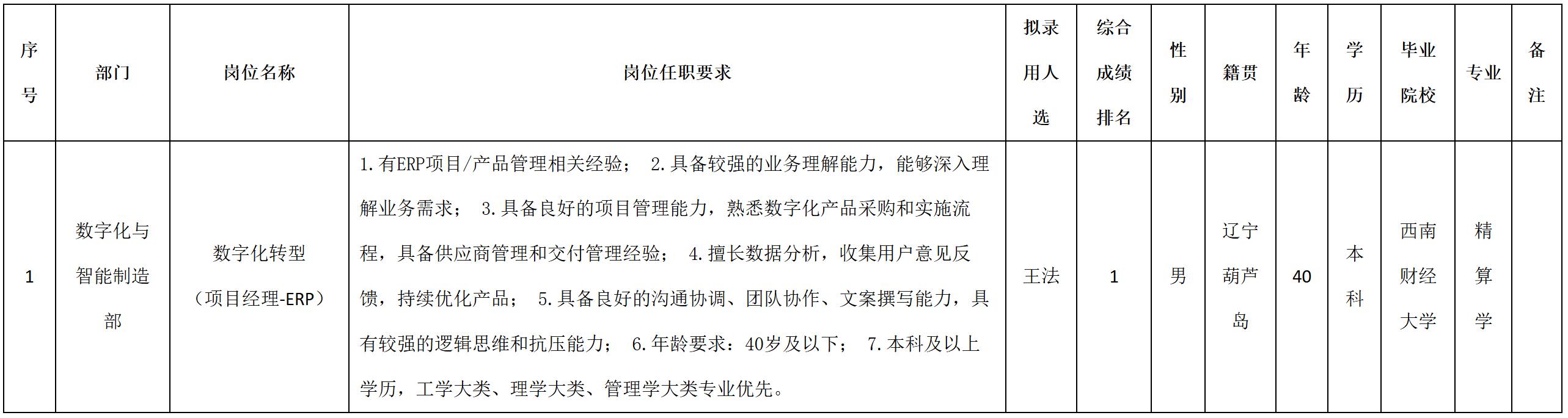 根據(jù)四川九洲投資控股集團(tuán)有限公司發(fā)布的招聘公告及招聘相關(guān)規(guī)定,經(jīng)筆試、面試、考察、體檢等程序,擬錄用王法同志到四川九洲投資控股集團(tuán)有限公司工作,現(xiàn)予以公示,具體情況如下: