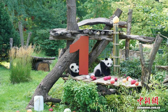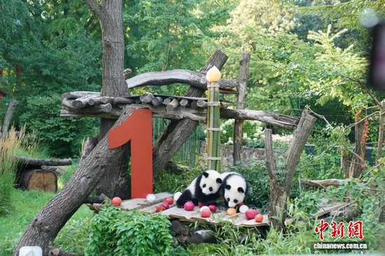 當?shù)貢r間8月22日,旅德大熊貓雙胞胎“夢好”和“夢甜”在柏林動物園歡度一周歲生日。圖為“夢好”和“夢甜”在玩耍。中新社記者 馬秀秀 攝