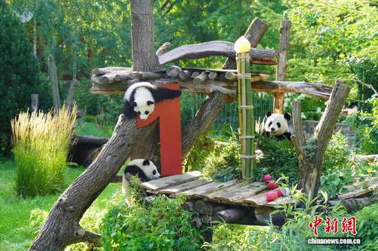 當?shù)貢r間8月22日,旅德大熊貓雙胞胎“夢好”和“夢甜”在柏林動物園歡度一周歲生日。圖為“夢好”和“夢甜”在媽媽“夢夢”(右一)陪伴下玩耍。中新社記者 馬秀秀 攝
