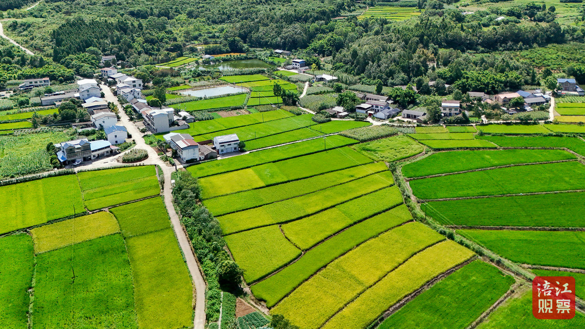 黃綠交織的田野間,農(nóng)房鱗次櫛比,道路如玉帶蜿蜒,水庫(kù)似碧玉鑲嵌在大地,盡顯寧?kù)o與祥和。