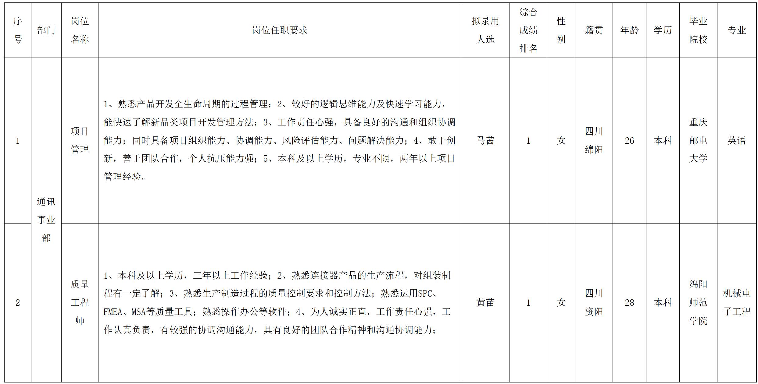 根據(jù)四川華豐科技股份有限公司發(fā)布的招聘公告及招聘相關(guān)規(guī)定,經(jīng)面試等程序,擬錄用馬茜等同志到四川華豐科技股份有限公司工作,現(xiàn)予以公示,具體情況如下: