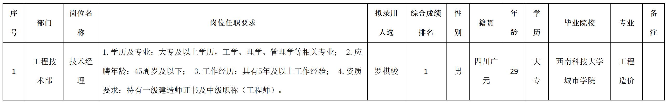 根據(jù)四川九洲建筑工程有限責(zé)任公司發(fā)布的招聘公告及招聘相關(guān)規(guī)定,經(jīng)筆試、面試、考察、體檢等程序,擬錄用羅棋駿同志到四川九洲建筑工程有限責(zé)任公司工作,現(xiàn)予以公示,具體情況如下:
