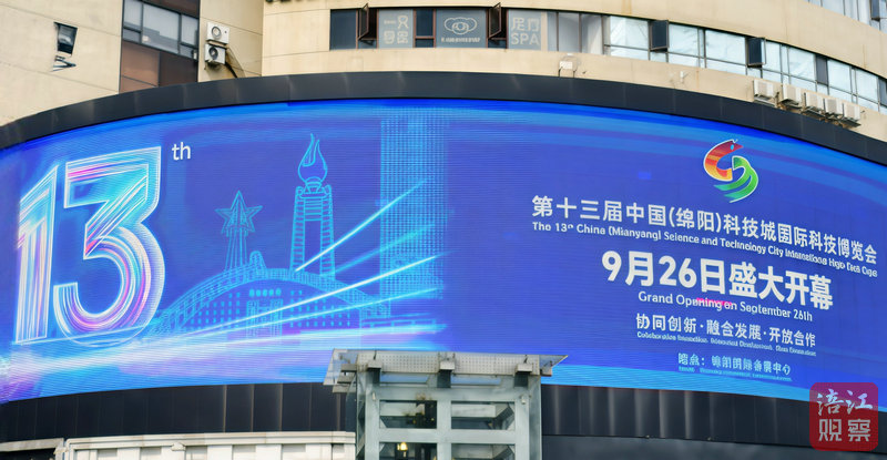8月28日,記者在綿陽(yáng)城區(qū)看到,臨園路百貨大樓南側(cè)的全彩LED顯示屏滾動(dòng)播放第十三屆科博會(huì)主題海報(bào)。與此同時(shí),數(shù)公里之外的城市奧萊一號(hào)門(mén)全彩LED顯示屏也呈現(xiàn)出科博會(huì)主題海報(bào)。在園藝山樂(lè)薈城,往來(lái)穿梭的市民與“科博藍(lán)”主題光影交相輝映,科技盛會(huì)的氛圍日漸濃厚。