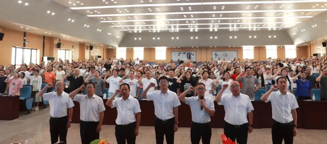 “我志愿成為一名人民教師,忠誠黨的教育事業(yè),遵守教育法律法規(guī),履行教書育人職責(zé),落實立德樹人根本任務(wù),引領(lǐng)學(xué)生健康成長……”該校黨委副書記、副校長尹漢平帶領(lǐng)全體教職工集體宣誓。錚錚誓言,拳拳丹心。全體教師以澎湃的激情、昂揚的斗志,矢志成為有理想信念、有道德情操、有扎實學(xué)識、有仁愛之心的“四有”好老師。