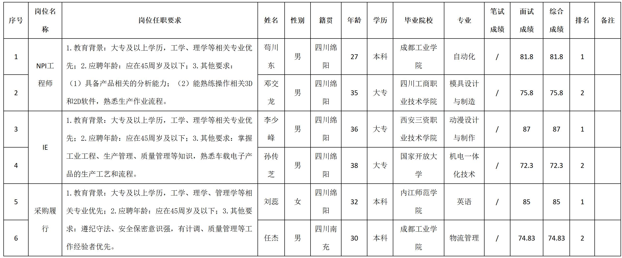 根據(jù)四川九州電子科技股份有限公司發(fā)布的招聘公告及招聘相關(guān)規(guī)定,經(jīng)筆試、面試等程序,現(xiàn)將筆試(面試)成績予以公示。