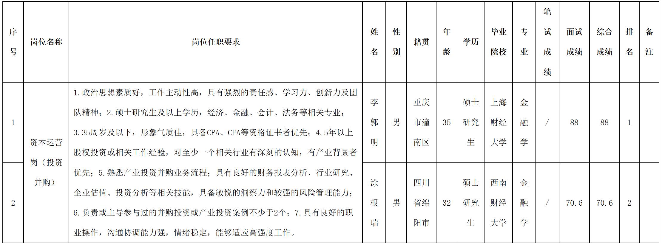 根據(jù)四川九洲創(chuàng)業(yè)投資有限責(zé)任公司發(fā)布的招聘公告及招聘相關(guān)規(guī)定,經(jīng)筆試、面試等程序,現(xiàn)將筆試(面試)成績(jī)予以公示。