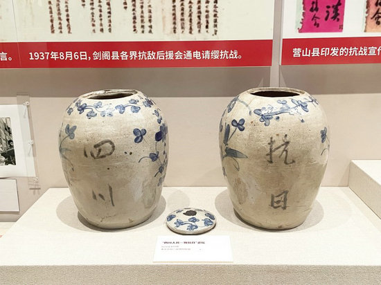 “偉大勝利川渝貢獻(xiàn)——紀(jì)念中國人民抗日戰(zhàn)爭暨世界反法西斯戰(zhàn)爭勝利80周年專題展”中展出的“四川人民一致抗日”瓷壇。李雨心 攝