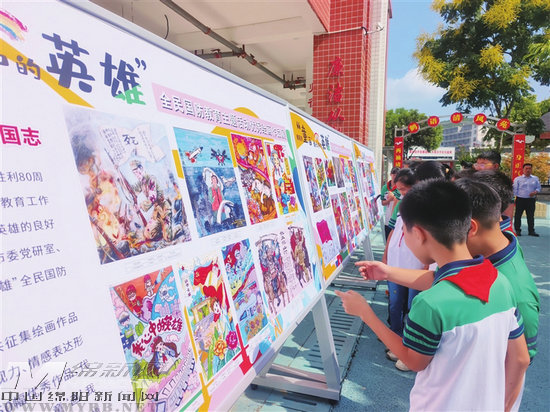 游仙區(qū)鶴林小學(xué)學(xué)生在全民國(guó)防教育主題活動(dòng)優(yōu)秀繪畫作品展展板前仔細(xì)觀看