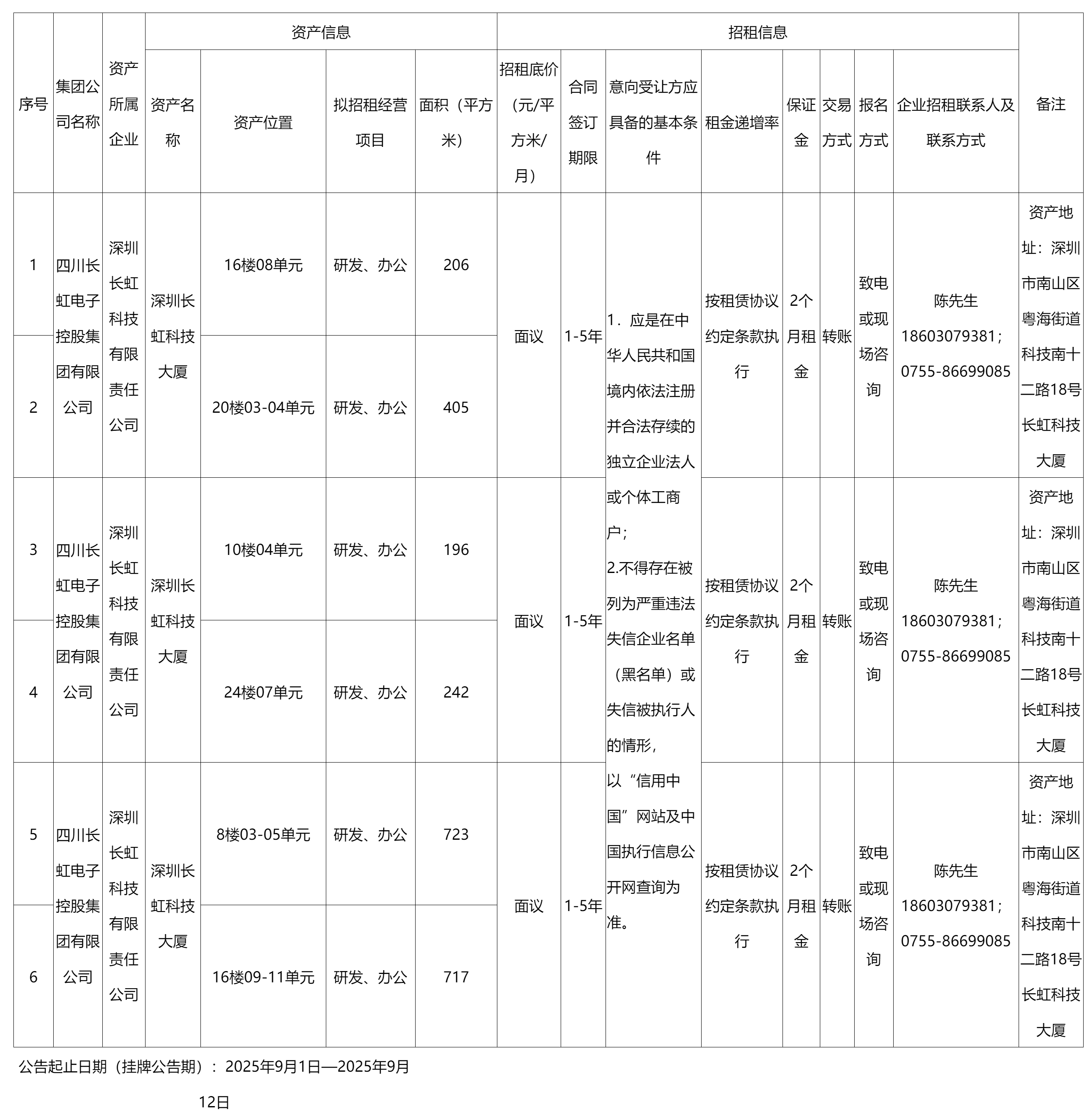 深圳長(zhǎng)虹科技有限責(zé)任公司資產(chǎn)出租公告