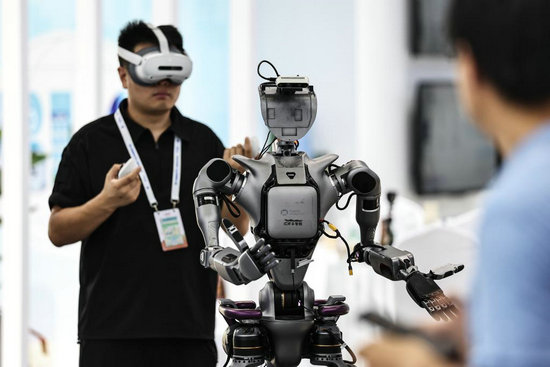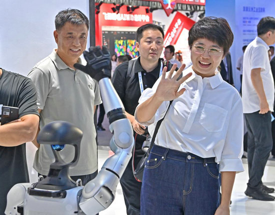 觀眾在2025全球工業(yè)互聯(lián)網(wǎng)大會現(xiàn)場與機(jī)器人互動。新華社記者 周華 攝