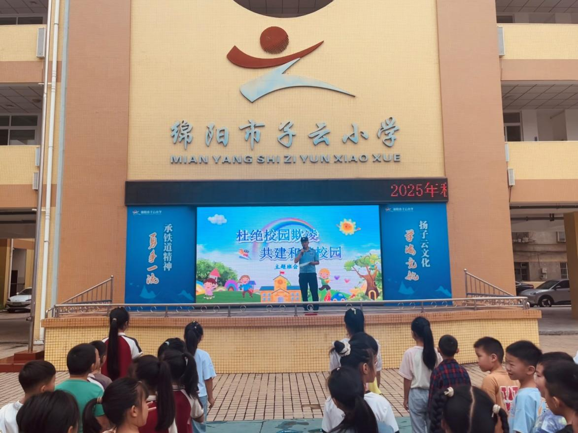 為了進一步加強校園法治安全教育,增強學生自我保護意識,營造和諧健康的成長環(huán)境。2025年9月2日,綿陽市子云小學特邀法治副校長、工區(qū)派出所民警吳天偉警官到校,為全體師生開展了以防欺凌為主題的普法教育活動。