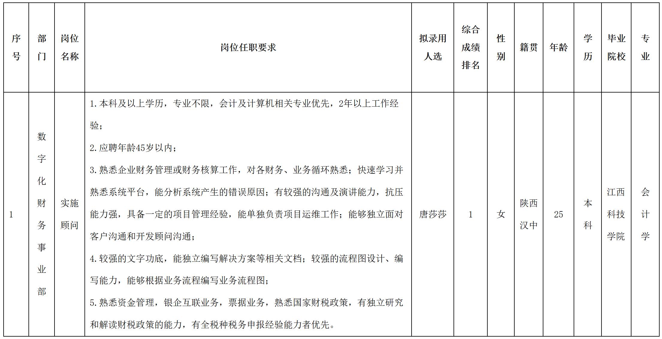 根據(jù)四川虹信軟件股份有限公司發(fā)布的招聘公告及招聘相關(guān)規(guī)定,經(jīng)面試、考察、體檢等程序,擬錄用唐莎莎同志到四川虹信軟件股份有限公司工作,現(xiàn)予以公示,具體情況如下: