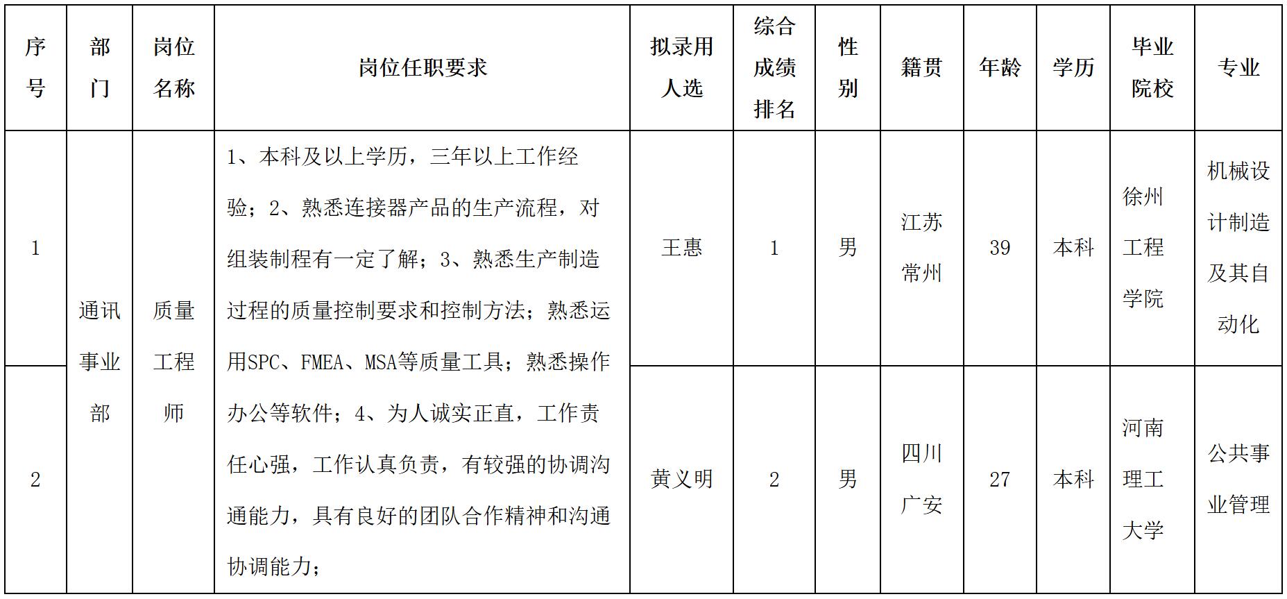 根據(jù)四川華豐科技股份有限公司發(fā)布的招聘公告及招聘相關(guān)規(guī)定,經(jīng)面試等程序,擬錄用王惠等同志到四川華豐科技股份有限公司工作,現(xiàn)予以公示,具體情況如下:
